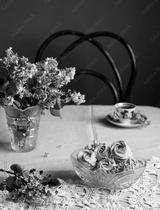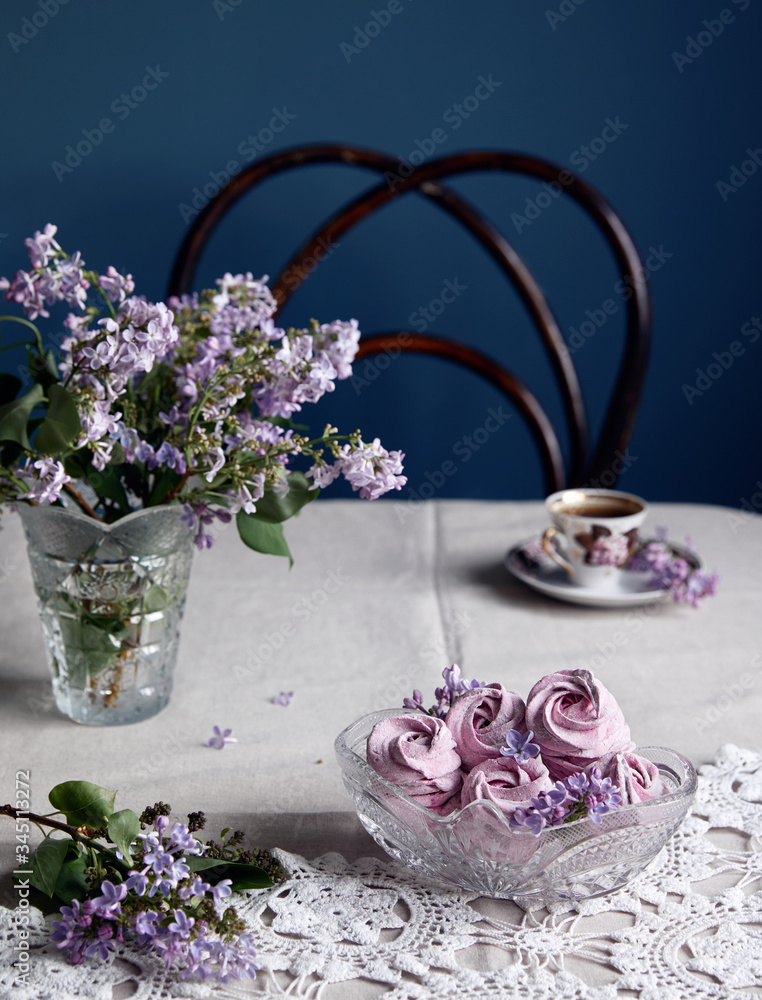 Violet sweet Zephyr Marshmallow near lilac flowers and cup of coffee