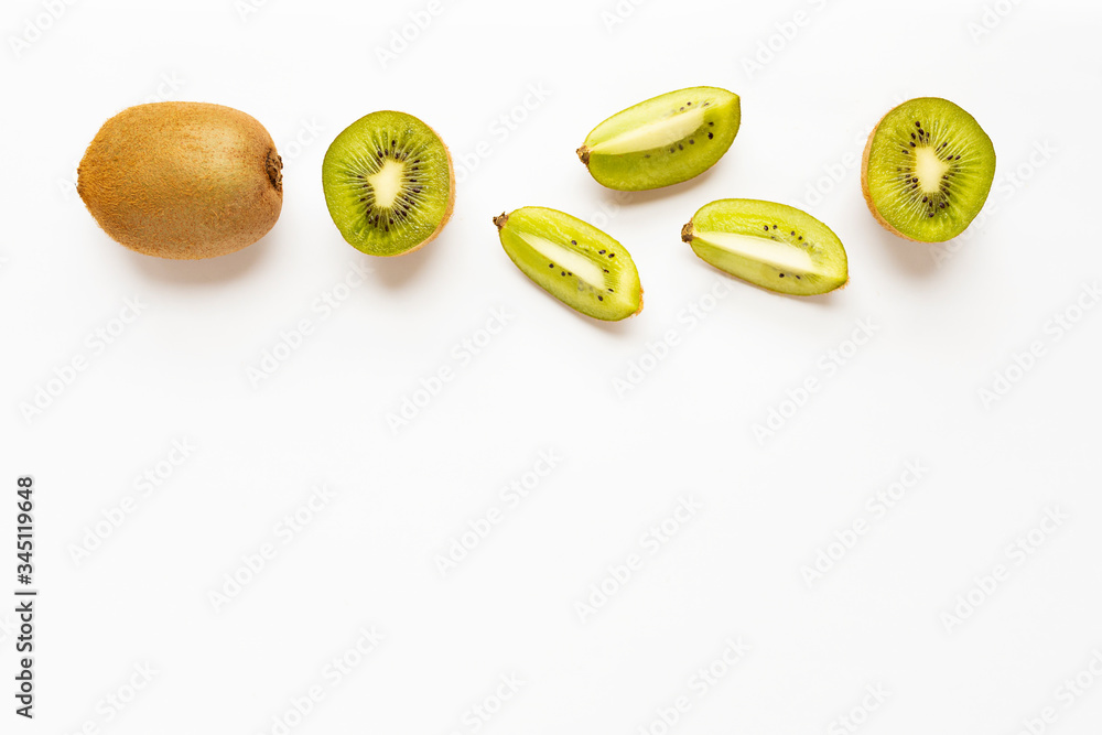 A set of fresh whole and sliced kiwis isolated on a white background. flat lay, copy space. Tropical abstract background.