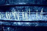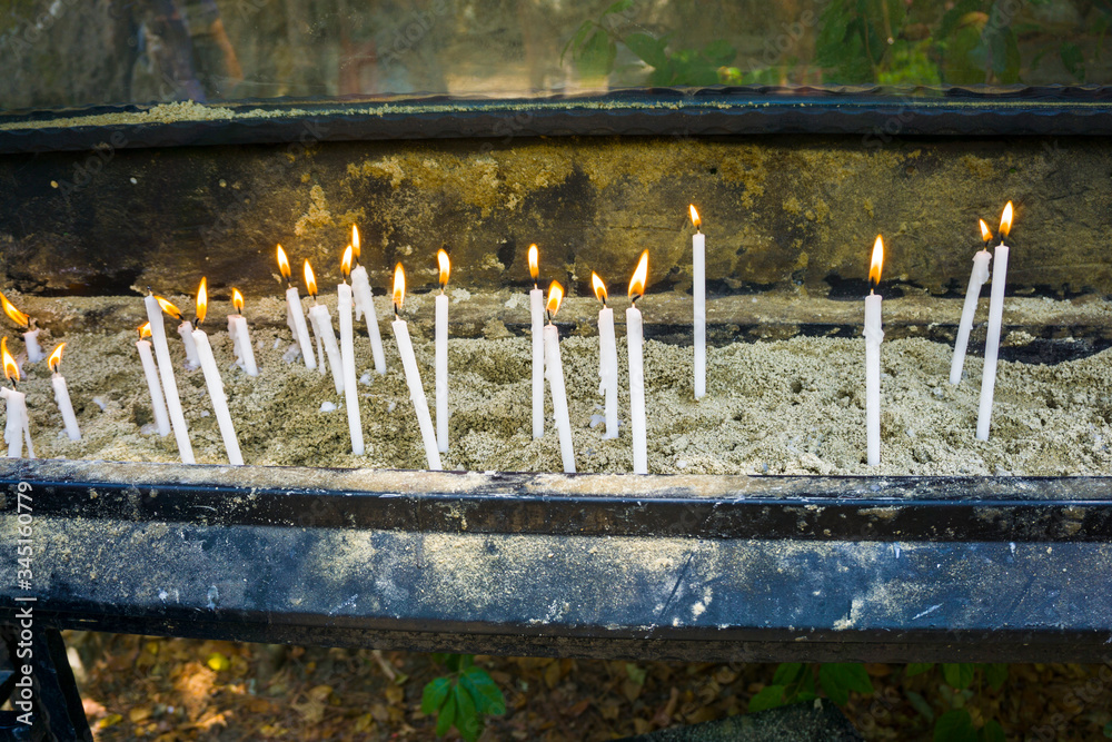 Lots of candles for good future wishes in church in darkness. Traditional faith for Orthodox, Catholic and Protestant believings. Orange, red, yellow lights on white candles on black wall background.