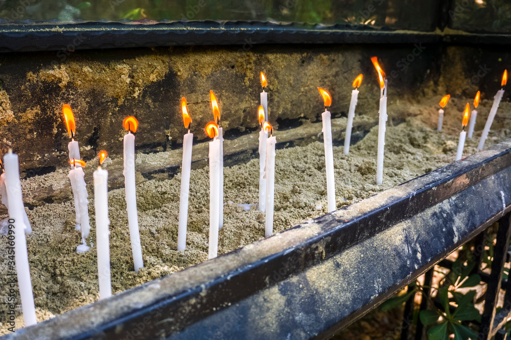 Lots of candles for good future wishes in church in darkness. Traditional faith for Orthodox, Catholic and Protestant believings. Orange, red, yellow lights on white candles on black wall background.