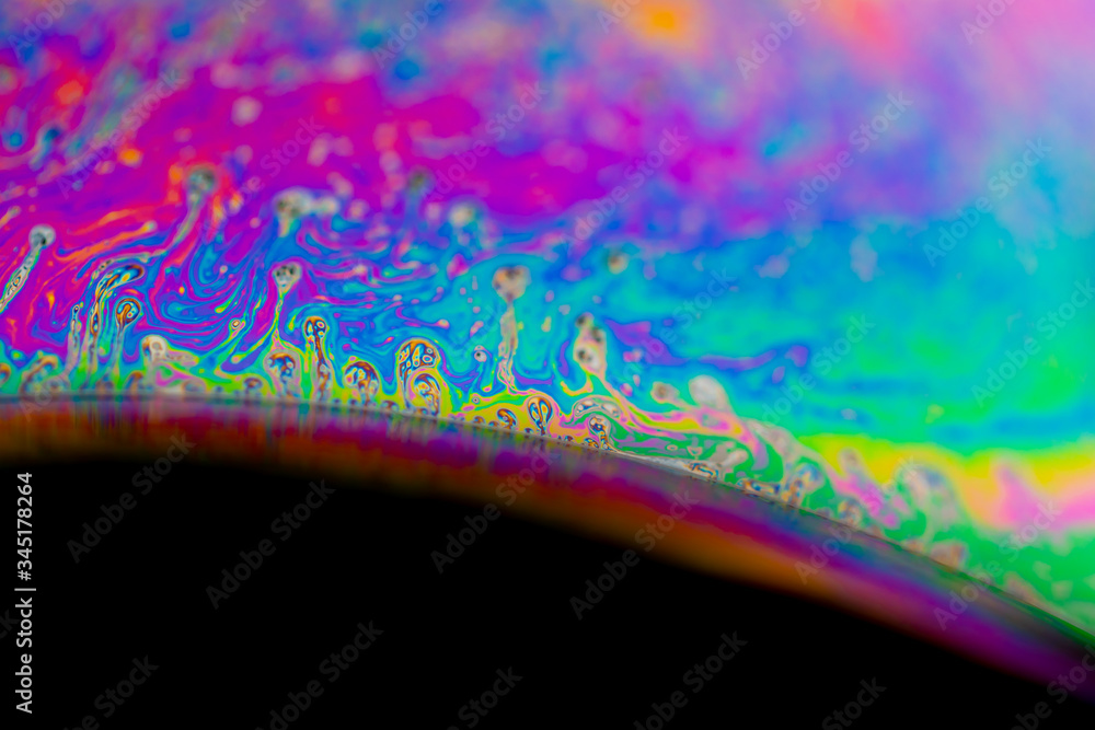 Psychedelic abstract planet from soap bubble, Light refraction on a soap bubble, Macro Close Up in soap bubble. Rainbow colors on a black background. Model of Space or planets universe cosmic galaxy.