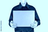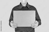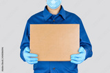 Delivery man in uniform medical mask and latex gloves holdind cardboard box in his hand isolated on gray background. Medical supplies delivery. Service quarantine pandemic coronavirus COVID 2019
