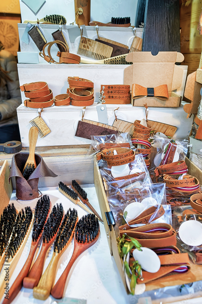 Wooden brushes and leather souvenirs at Riga Christmas market