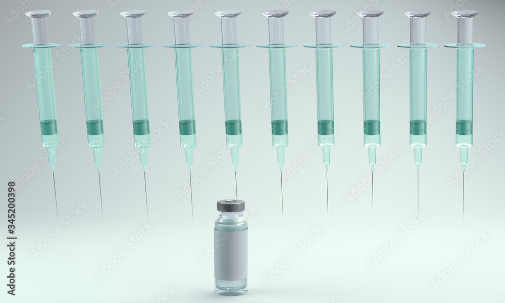many syringes with small vial on white background.3D rendering