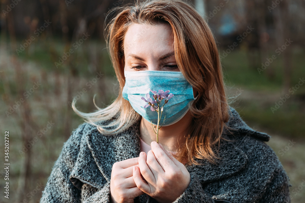 A young blonde woman inhales the smell of a flower through a medical mask.