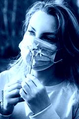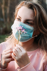 A young blonde woman inhales the smell of a flower through a medical mask.
