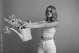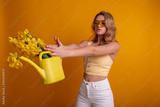 Pretty girl over yellow background with watering can full of narcissus flowers. Creative photography.