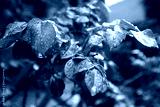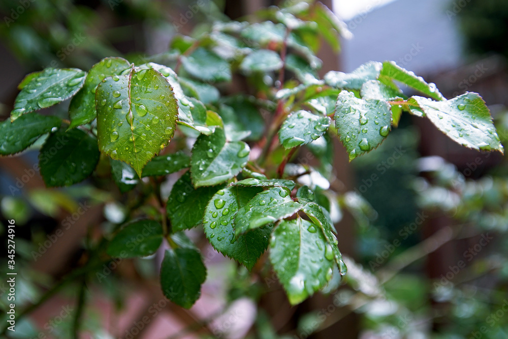 young rose leaves covered with rain drops