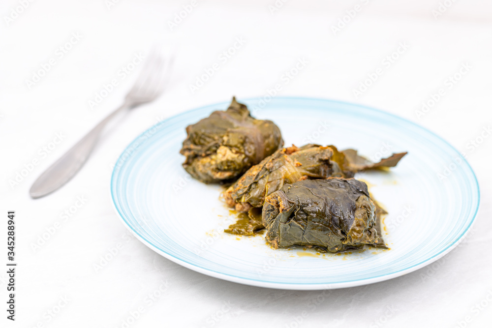 Minced meat rolls in Chard served on the plate. Traditional balkan meal made with chard and minced meat.