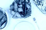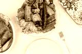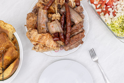 Served table with food on the plates. Top view of grilled meat salad bread and plate on the table