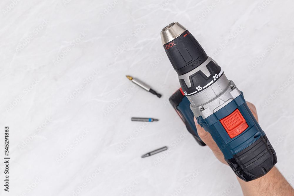 Top view of Blue battery drill in the hand above white background with copy space