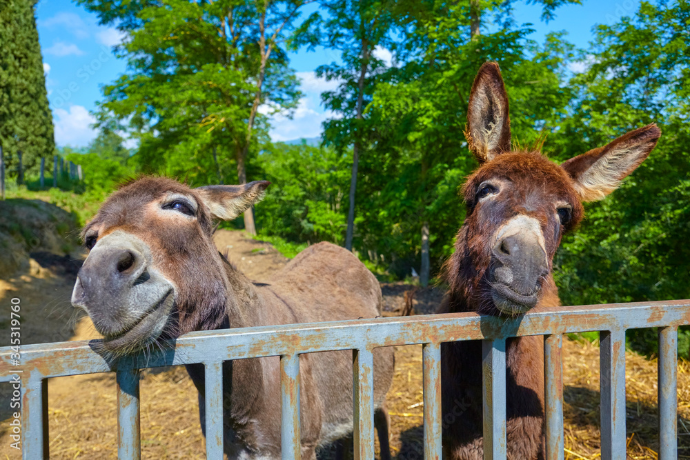 Two playful donkeys on a farm in Tuscany, Italy.