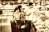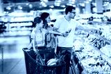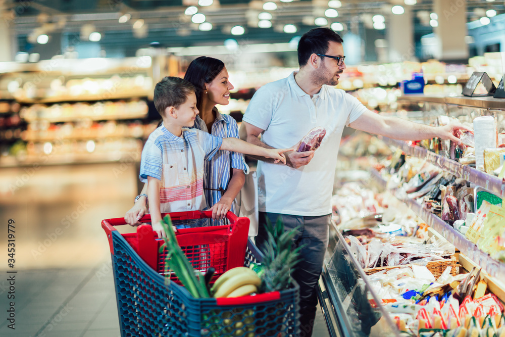 Happy family with child and shopping cart buying food at grocery store or supermarket