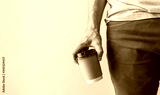 closeup male hand holding a hot coffee cup with soft-focus and over light in the background
