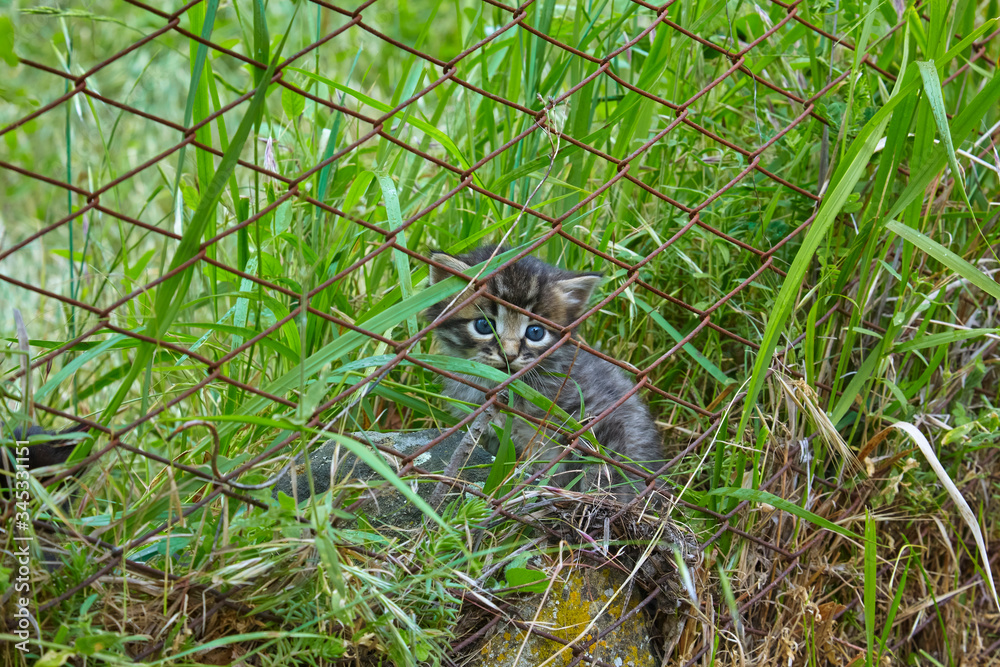 Beautiful young cat is hiding behind a fence.