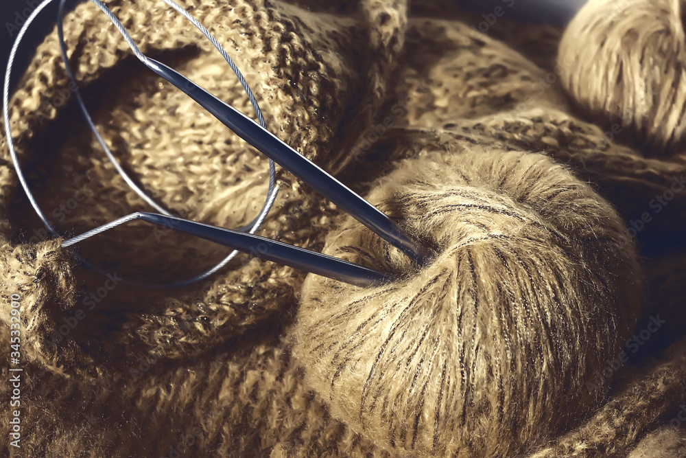 threads and knitting needles. Knitting blankets. Knitted sweater. Needlework as a hobby and business