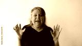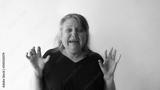 Scared old woman with green eyes smiling at camera. One beautiful green eyed elder woman with panic attack concept. Modern blonde lady with casual hair isolated on white wall background.