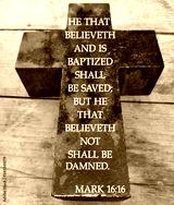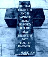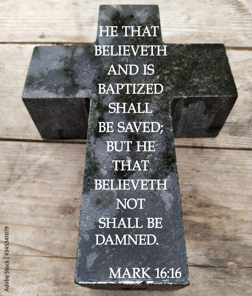 Bible quote sign on black granite stone cross background. Inspirational verse praying thought. He that believeth and is baptized shall be saved, but he that believeth not shall be damned. Mark 16:16.