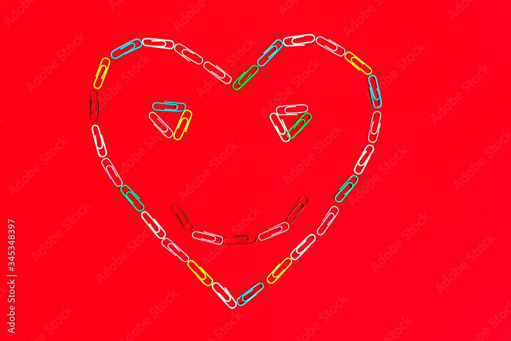 Stationery colorful paper clips chaotically scattered and made smile heart on red background.