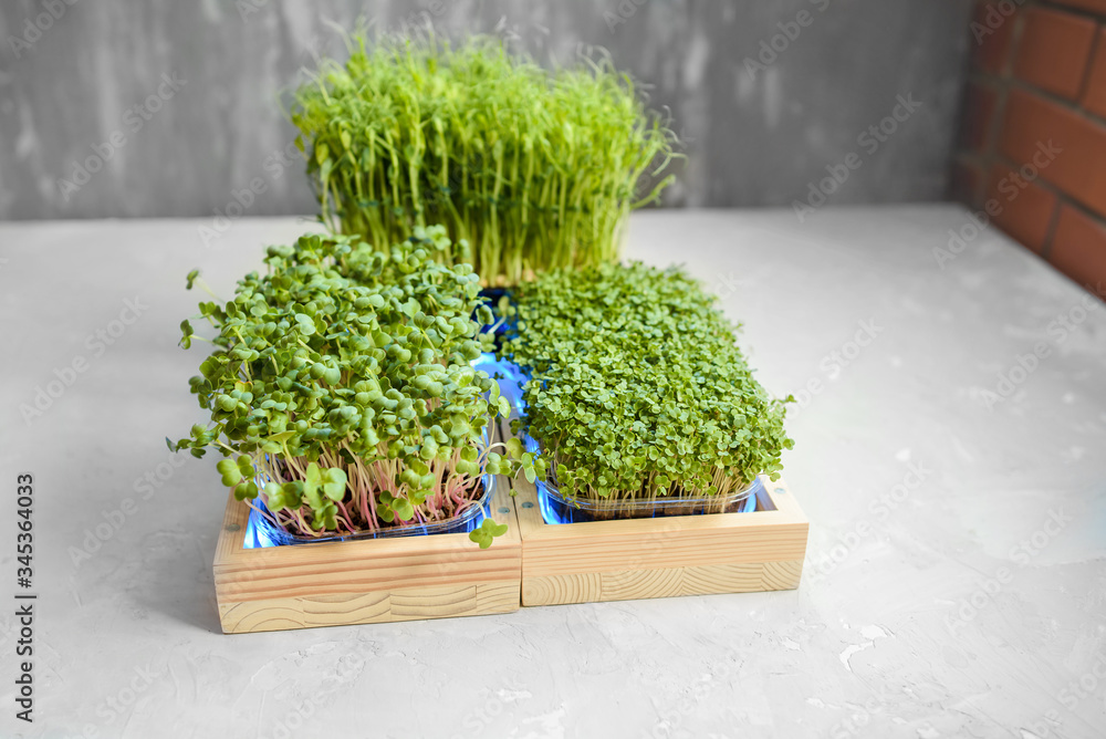 Fresh juicy green microgreens grow in trays.
