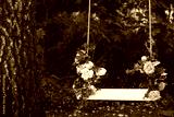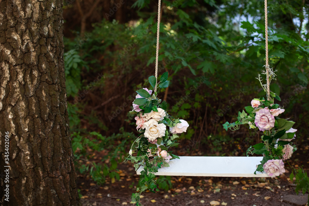 Wooden swing in playground outdoors. Empty swing placed in park. Wedding swing decorated with flowers roses. Garden swing hanging from a large tree on green grass background. Garden decor. Romance