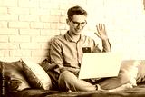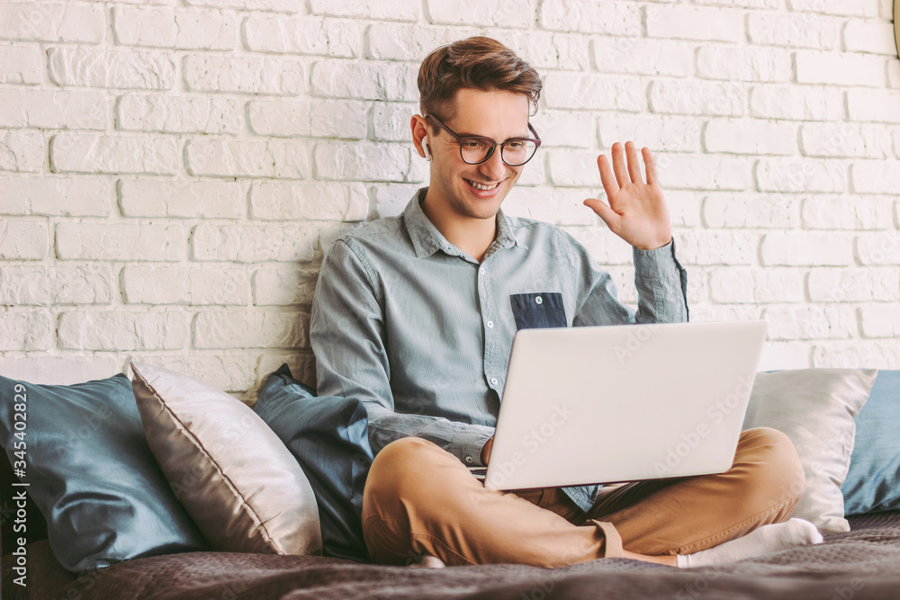 Stylish young hipster man student in glasses waving hand to laptop while talking online video call and sitting on couch. Happy businessman freelancer having web meeting, conference. Work at home