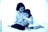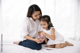 Happy Asian family. Mother and daughter putting coins into piggy bank together on the bed in the house with sunlight from the window. savings concept.