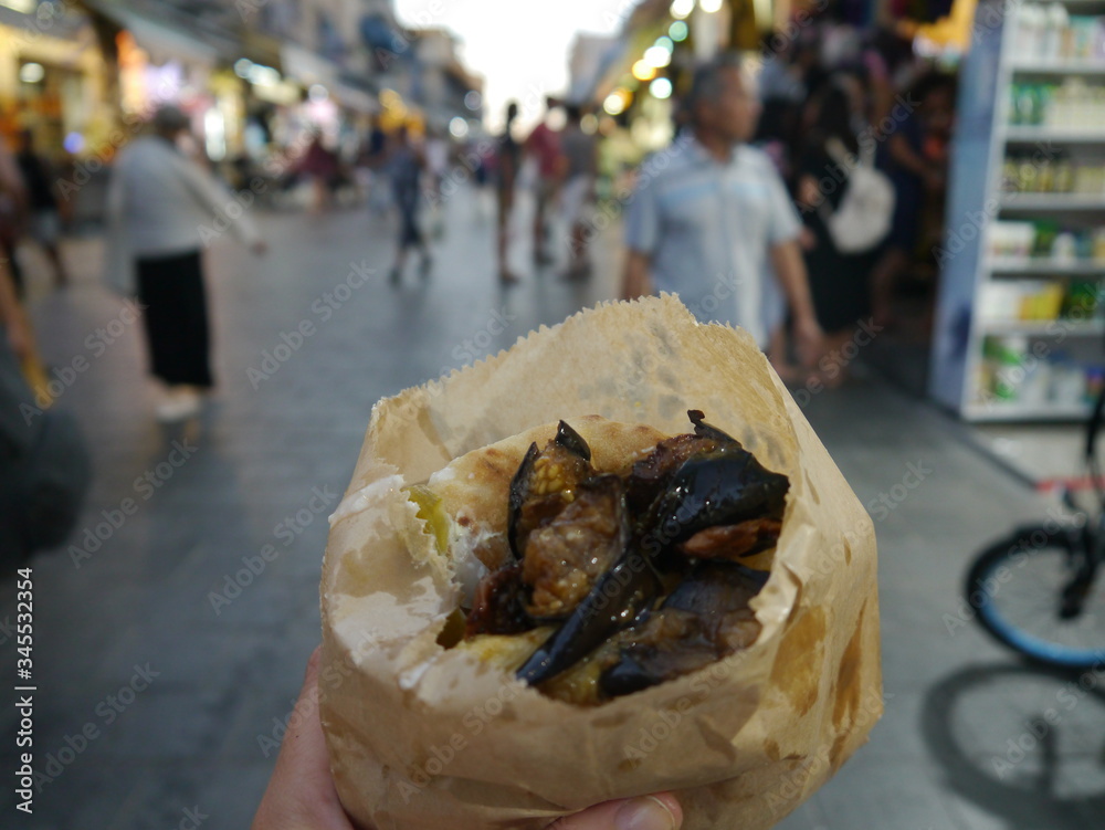 delicious falafel sandwich at busy Mahane Yehuda Market, Jerusalem, Near Eadt
