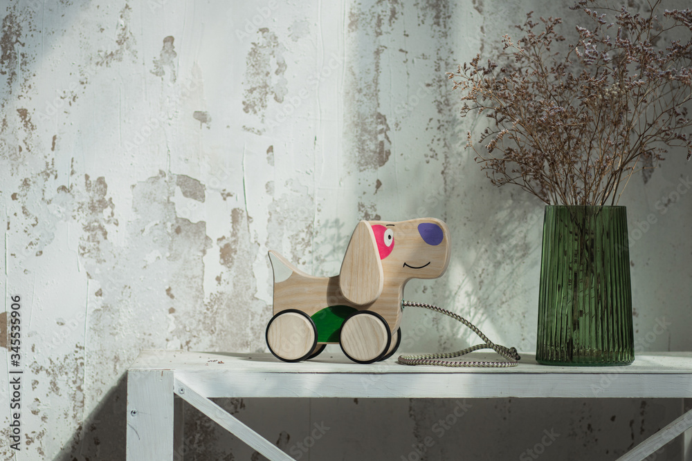 Photo of a wooden dog on wheels of beech on table.A toy for entertaining children and resting parents