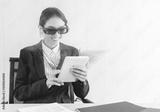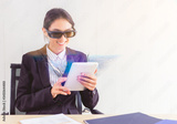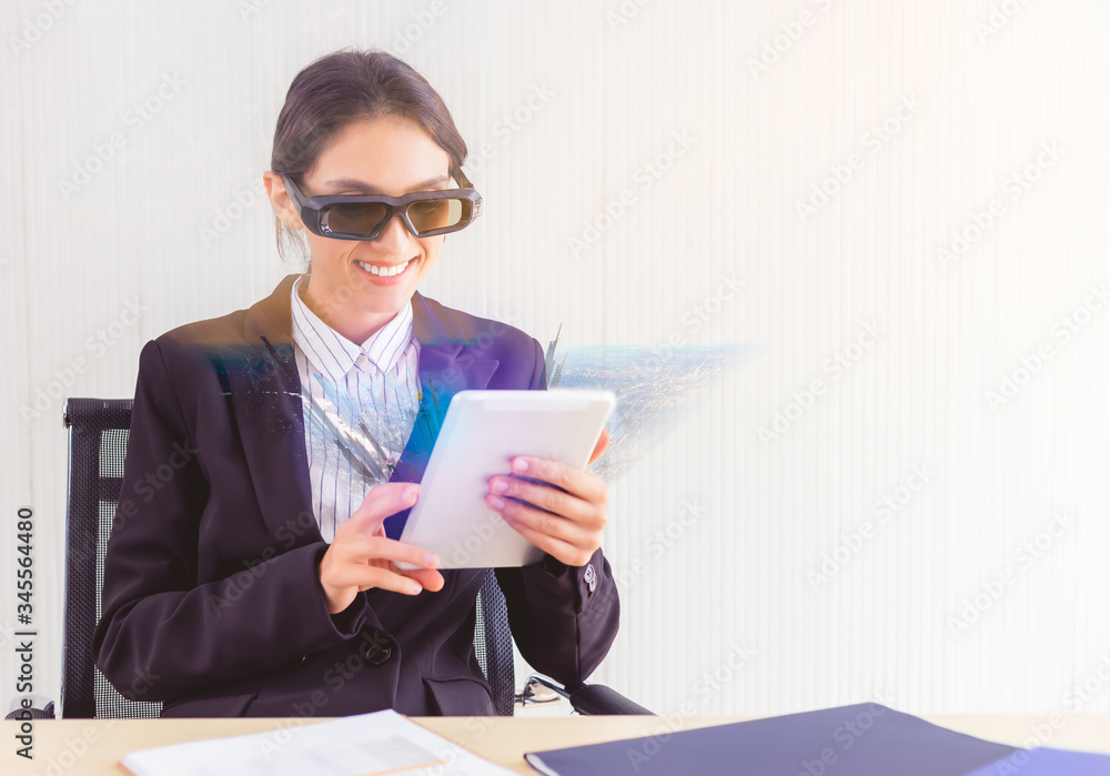 Business woman searching beautiful landmark or travel location for traveling by using high technology tablet computer, 3D vr glasses with technology virtual at her office. future technology concept.