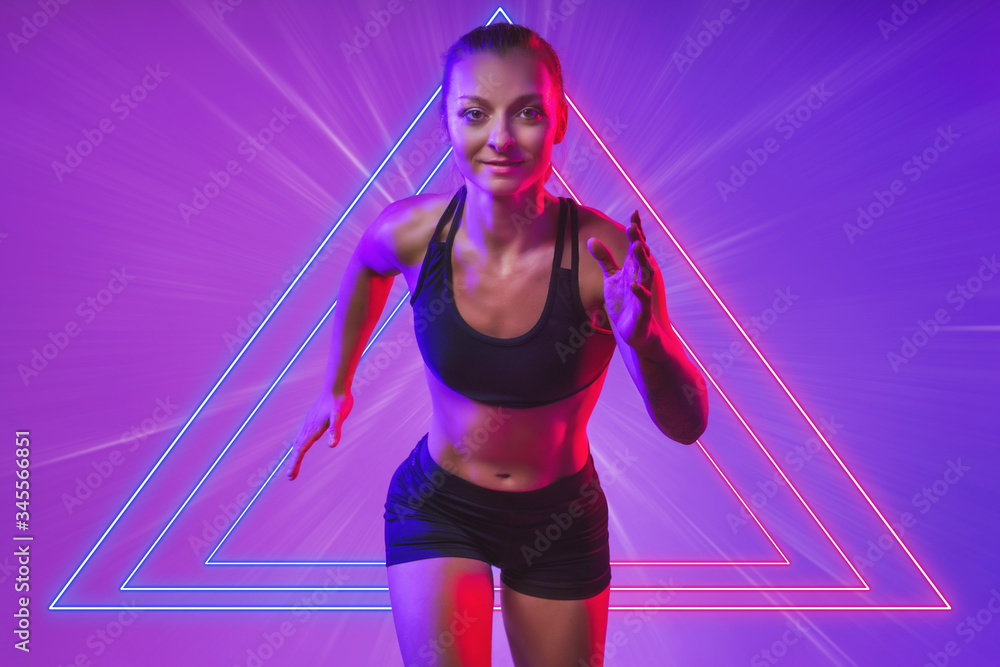 Sport backgrounds. Runner isolated on black. Dramatic magic scene with fallen neon stars.
