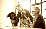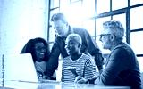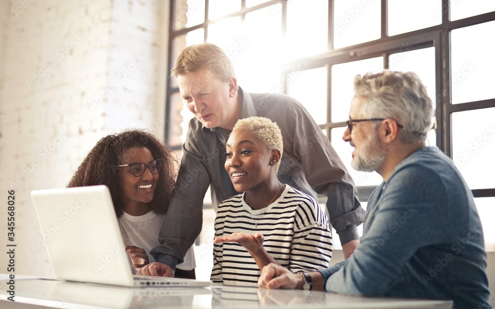 group of colleagues in the office in front of a computer