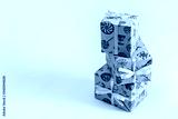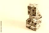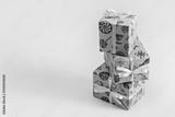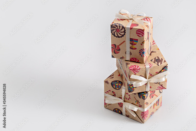 Set of vertical gift boxes packed in elegant paper. Copy space, white background.