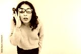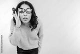brunette woman squints holding glasses in her hand on gray background with copy space