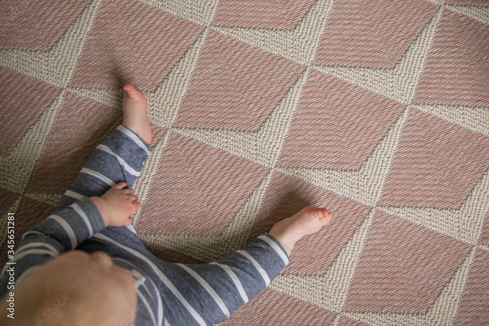A baby in blue clothes sitting on a rug at home shot from overhead