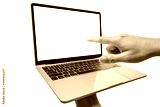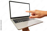 Hand holding laptop and point at the digital screen monitor, businessman presentation to teamwork concept, isolated on white background with clipping path