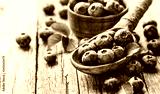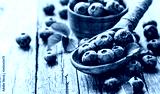 Blueberries in wooden spoon on old wood table. Healthy eating and nutrition concept.