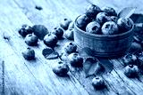 Freshly picked blueberries in wooden bowl on wooden background. Healthy eating and nutrition.