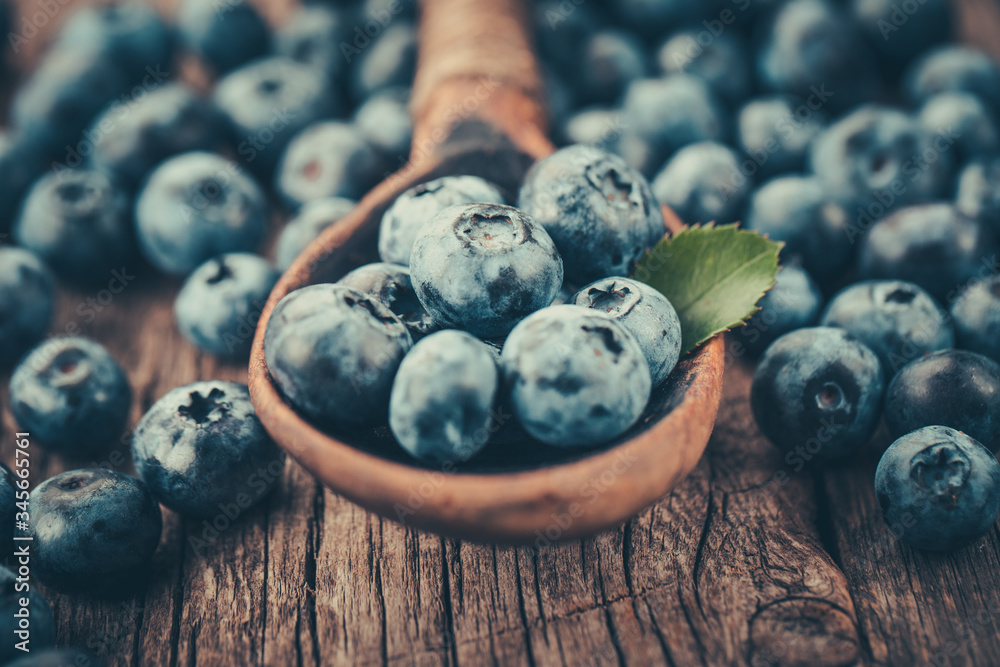 Blueberries in wooden spoon on old wood background. Healthy eating and nutrition concept.