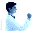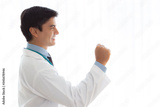 Doctor get happy, smile, excited, hold fist yes, celebrating in hospital. He get successful of cure illness with happiness, smiley face in medical room at hospital. Medical mature doctor get confident