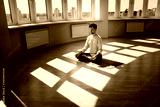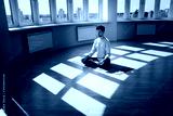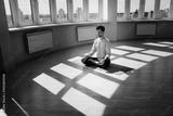 Man practice yoga. Young attractive male doing breathing exercises. Guy meditating at home along during the pandemic. Relaxation and resting concept for isolation. Slide shot.