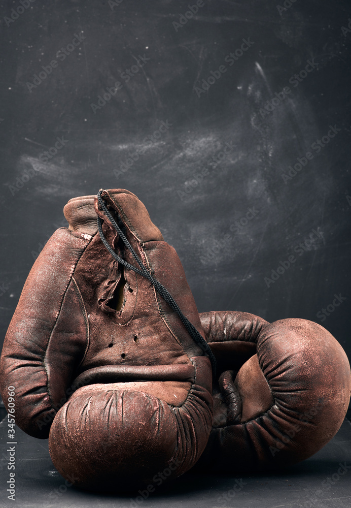 brown leather vintage boxing gloves on a black background