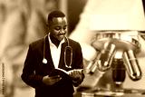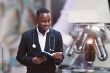 African doctor with stethoscope wearing classic suit reading a book near modern clinic hospital building