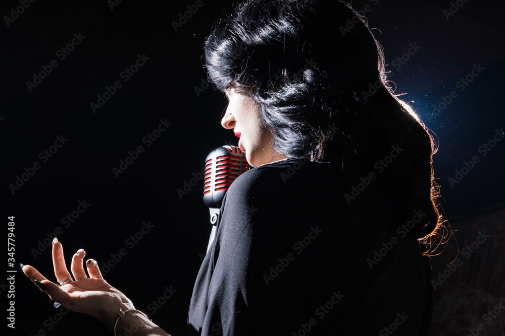 Gorgeous vintage 1950s lady with microphone in a black dress....