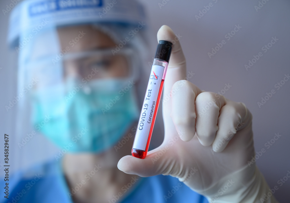 Nurse wearing scrubs and holding a sample test tube with blood for 2019-nCoV analyzing. Conceptual of laboratory testing for the respiratory coronavirus disease 2019.
