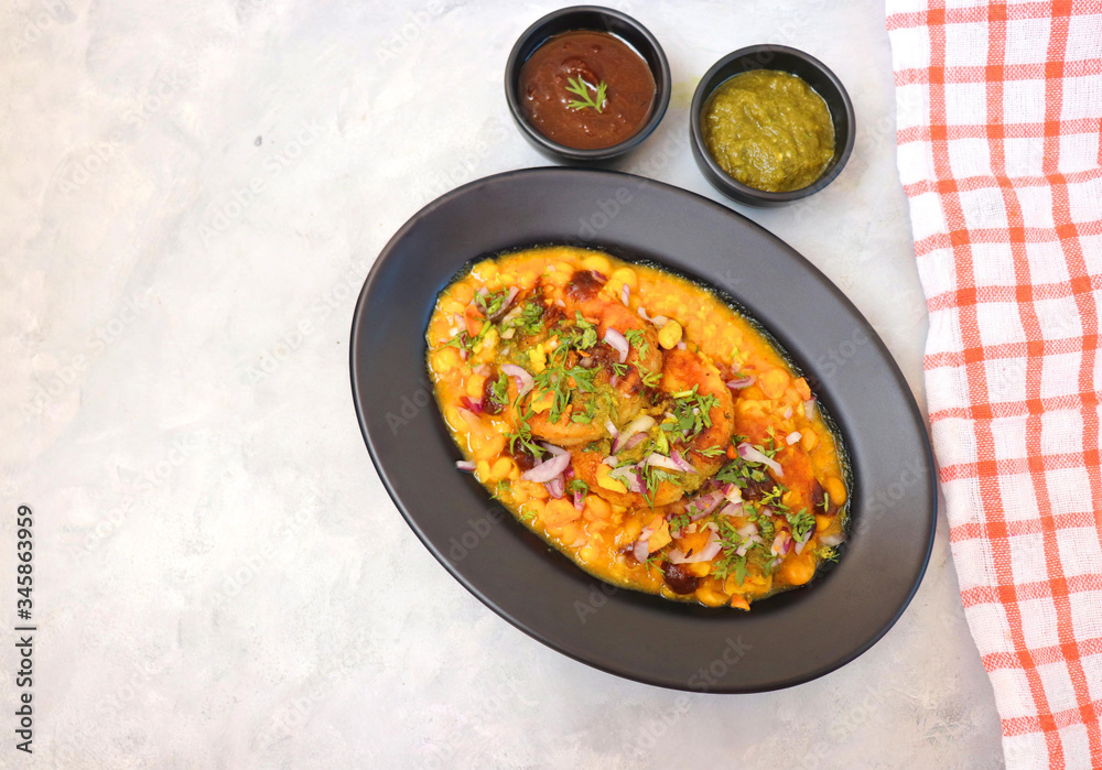 Indian Food-Ragda Pattice is popular street food of India. Ragada is a curry made of yellow vatana & pattice is made of potatoes along with spices. garnished with Sweet & mint chutney, chopped onions.