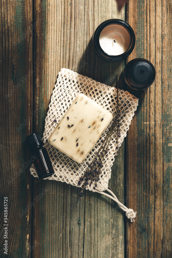 Organic lavender soap on wooden background. Eco natural bathroom accessories, natural cosmetics products and tools. Zero waste concept. Plastic free.