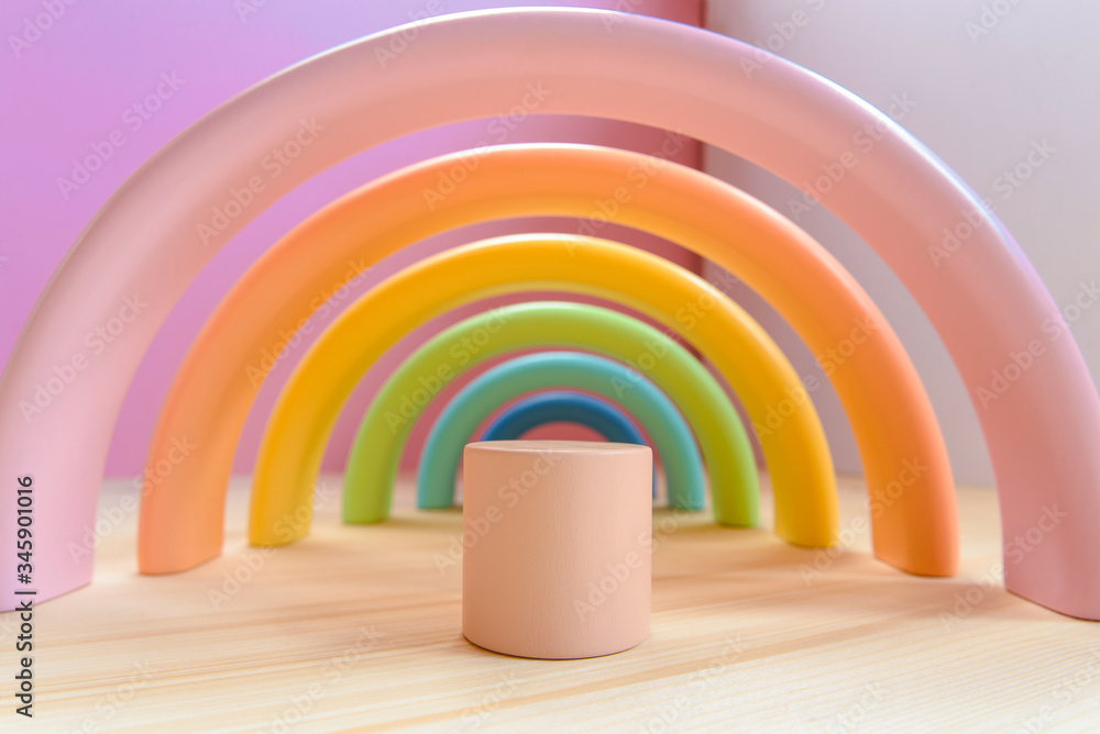 Abstract figures from elements of the children's designer wooden pastel rainbow on a wooden podium.