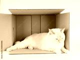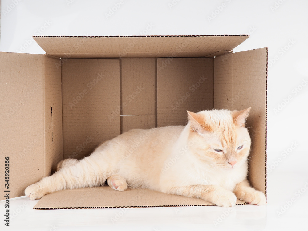Ginger tomcat lying in the paper box, cardboard box with a cat on white background