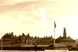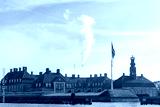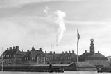 Industrial pipes of the plant emit smoke into the sky against the background of an old beautiful Scandinavian Palace in Denmark, Concept of air pollution in old retro cities